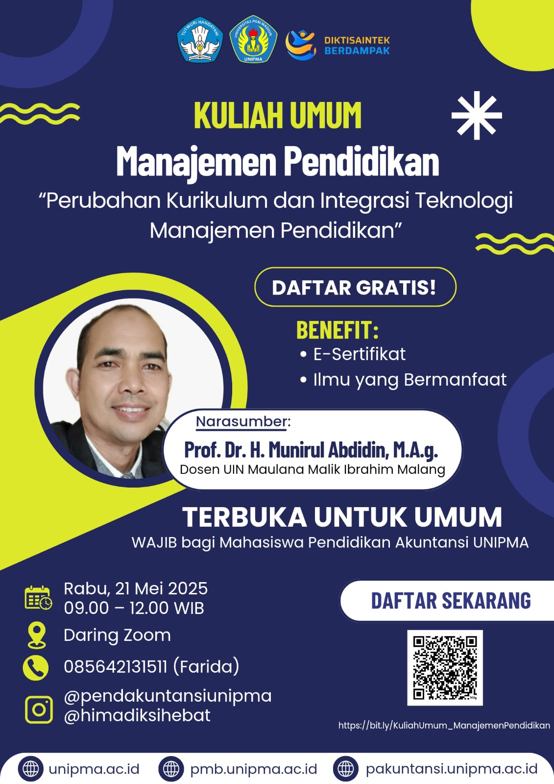 Kuliah Tamu Manajemen pendidikan dengan tema “ Perubahan Kurikulum dan Integritas teknologi manajemen pendidikan” dilaksanakan pada tanggal 21 Mei 2025. Terlampir Pengumuman dari Program Studi Pendidikan Akuntansi.